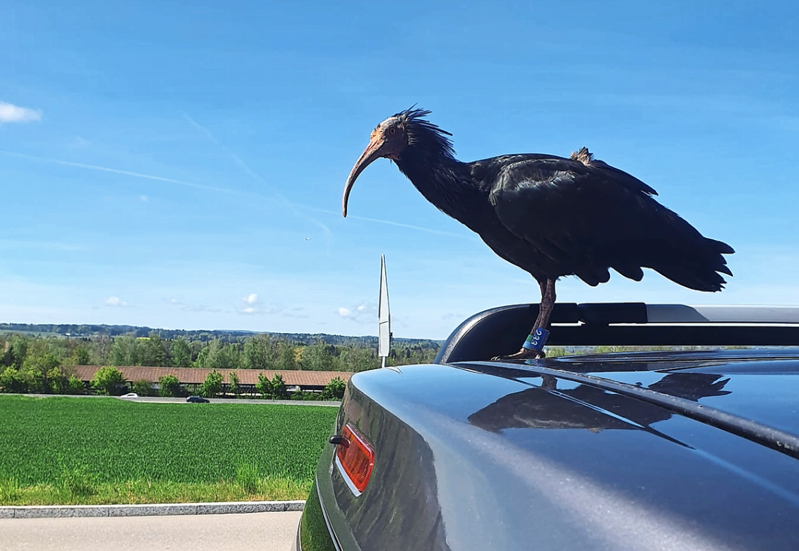 Normalerweise sorgen in der Flughafenstadt eher Vögel aus Metall und mit Turbinen für Schlagzeilen. Am Samstag entdeckte Leser Alex Baumgartner aber einen Waldrapp, ein weltweit äusserst seltener Vogel. Er machte auf Baumgartners Autodach eine Pause beim Flug Toskana–Bodensee.